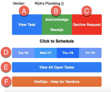 D. Click to Schedule - updates the task in the OwlOps app and lets you know the vendor has scheduled a time to come.
