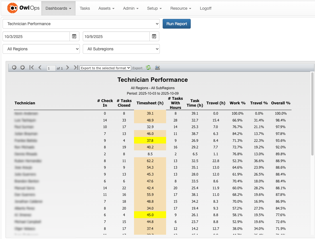 The Technician Performance Report provides a summary of each technician’s productivity and time allocation across a selected date range.